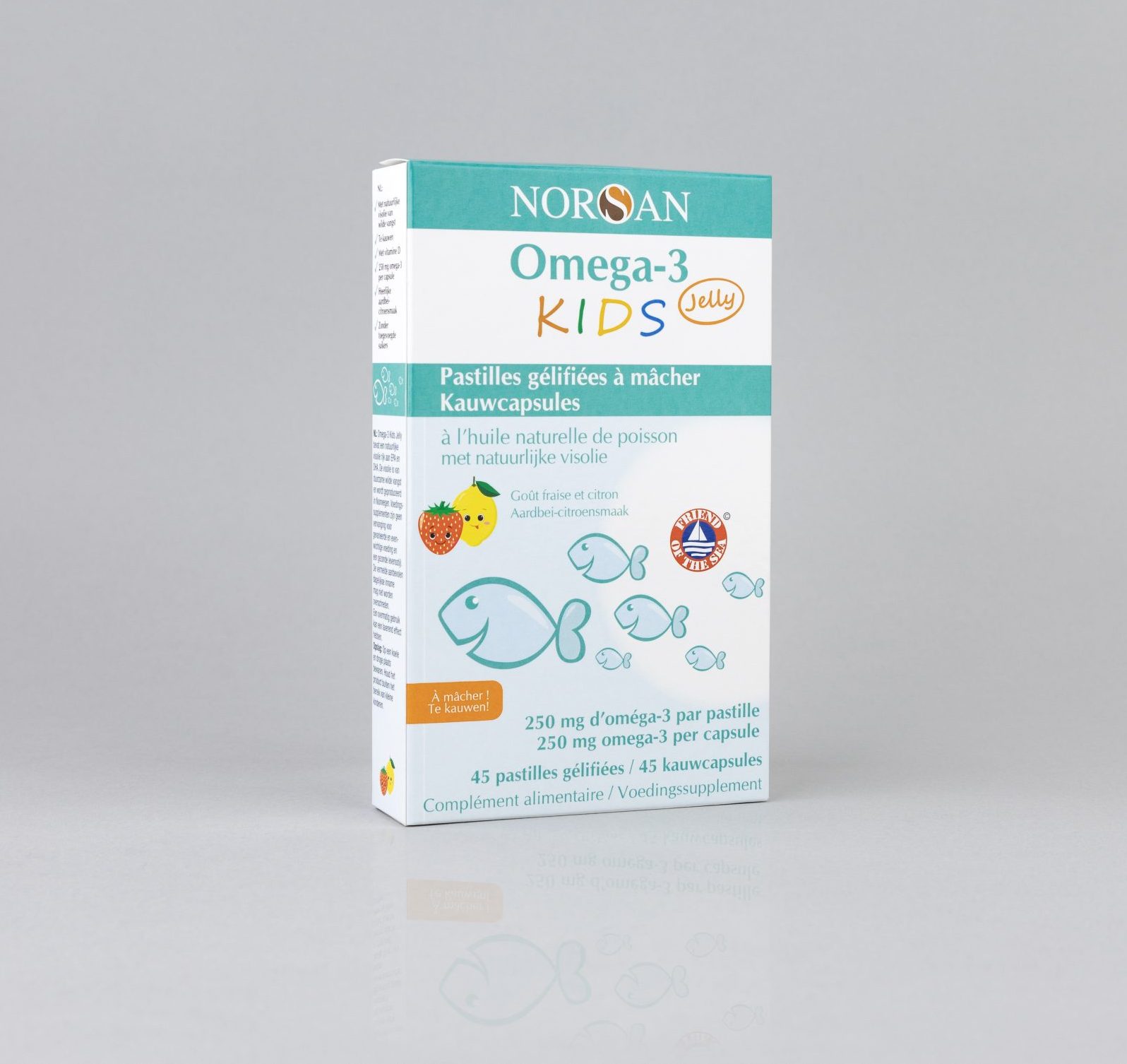 - Ingrediënten: natuurlijke visolie, zoetstoffen (xylitol, sorbitol), water, gelatine, aroma (citroen, aardbei), natriumcitraat, appelzuur, paprika-extract, vitamine D3